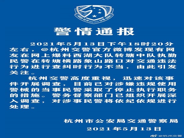 @杭州交警 微博5月13日晚间通报:5月13日18时20分左右,发现有网友在网上爆料西湖大队转塘中队执勤民警在对交通违法行为进行查纠时行为不当,由此引发关注。