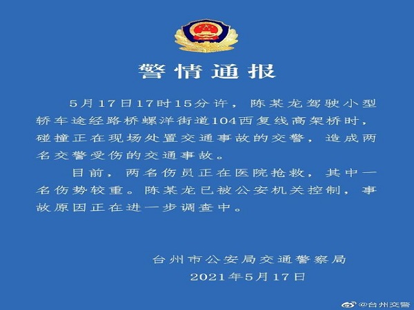 中新经纬客户端5月18日电 17日晚间,浙江省台州市公安局交通警察局官方微博发布通报称,5月17日17时15分许,陈某龙驾驶小型轿车途经路桥螺洋街道104西复线高架桥时,碰撞正在现场处置交通事故的交警,造成两名交警受伤的交通事故。