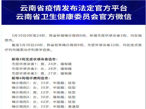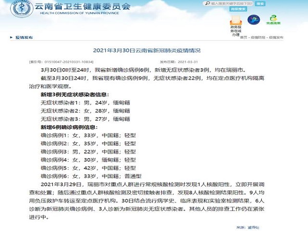 3月31日,云南省卫健委通报,3月30日0时至24时,云南省新增新冠肺炎确诊病例6例,其中1例为缅甸籍,其余5例为中国籍;新增无症状感染者3例,均为缅甸籍。