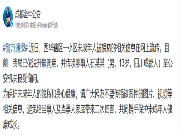 成都警方通报13岁男孩猥亵事件:已依法开展调查
