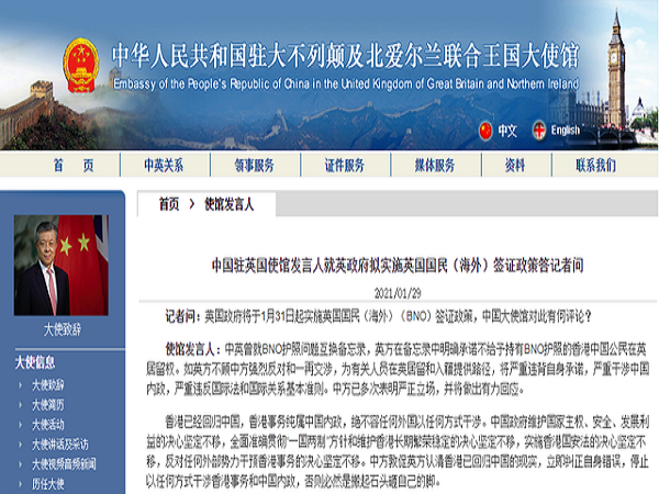 英政府拟实施英国国民(海外)签证政策,中使馆回应