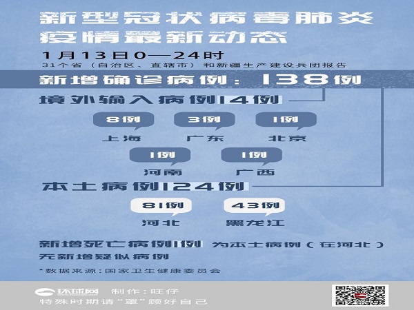 1月13日0—24时,31个省(自治区、直辖市)和新疆生产建设兵团报告新增确诊病例138例,其中境外输入病例14例(上海8例,广东3例,北京1例,河南1例,广西1例),本土病例124例(河北81例,黑龙江43例);新增死亡病例1例,为本土病例(在河北);无新增疑似病例。