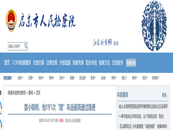 据江苏启东市人民检察院官方日前通报,一名启东男子一年内“蹭”车过ETC,逃避缴纳高速过路费5000多元,最终被判处有期徒刑八个月。