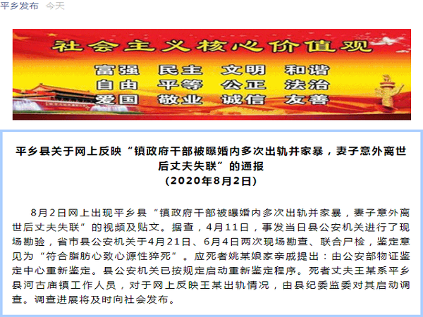 平乡县关于网上反映“镇政府干部被曝婚内多次出轨并家暴,妻子意外离世后丈夫失联”的通报