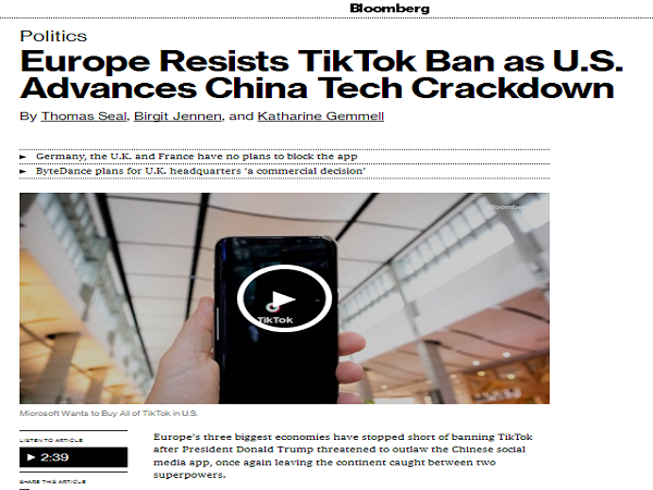 【环球网报道 记者 张晓雅】“美国加大力度打压中国科技的同时,欧洲抵制TikTok禁令。”
