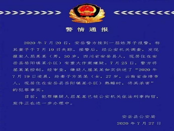 齐鲁网·闪电新闻7月27日讯 7月27日凌晨,四川安岳警方发布警情通报,“安岳版杀妻案”告破。通报称,7月20日,安岳警方接到一屈姓男子报警,称其妻子于7月19日失踪。