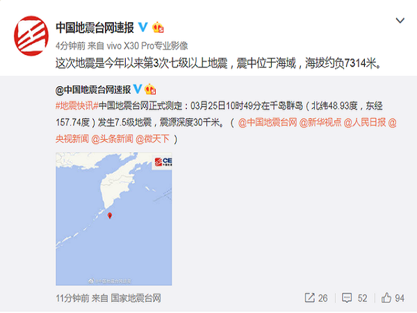 中国地震台网正式测定:03月25日10时49分在千岛群岛(北纬48.93度,东经157.74度)发生7.5级地震,震源深度30千米。