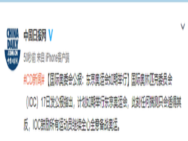 中国日报网3月18日电(高琳琳) 国际奥林匹克委员会(IOC)17日发布公报指出,计划如期举行东京奥运会,此刻任何揣测只会适得其反,国际奥委会鼓励所有运动员继续全心全意备战奥运。