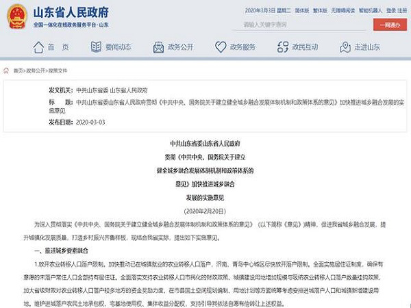 3月3日,山东省政府网站发布《中共山东省委山东省人民政府贯彻<中共中央、国务院关于建立健全城乡融合发展体制机制和政策体系的意见>加快推进城乡融合发展的实施意见》,提出加快推动已在城镇就业的农业转移人口落户,济南、青岛中心城区尽快放开落户限制。