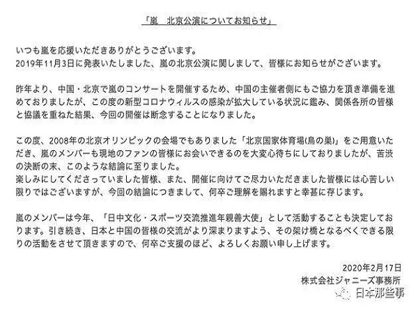 昨天下午,ARASHI宣布原定在今年4月举行的北京鸟巢演唱会,因为新型冠状病毒疫情影响,最终决定取消。