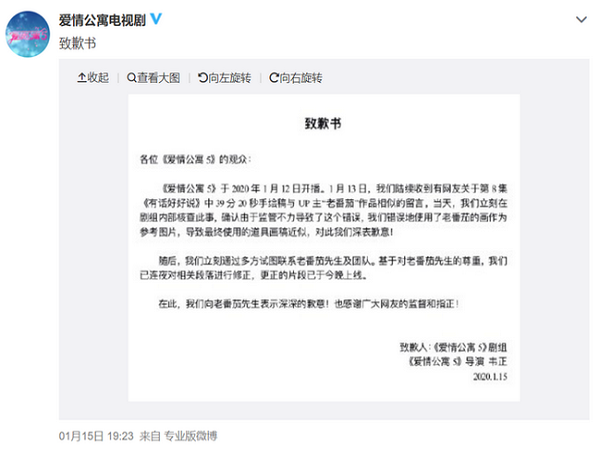 1月15日晚间,《爱情公寓5》官方微博发布致歉书称,由于监管不力,错误地使用了UP主“老番茄”的画作为第8集中手绘稿的参考,导致最终使用的道具画稿近似,剧组对此表达歉意。