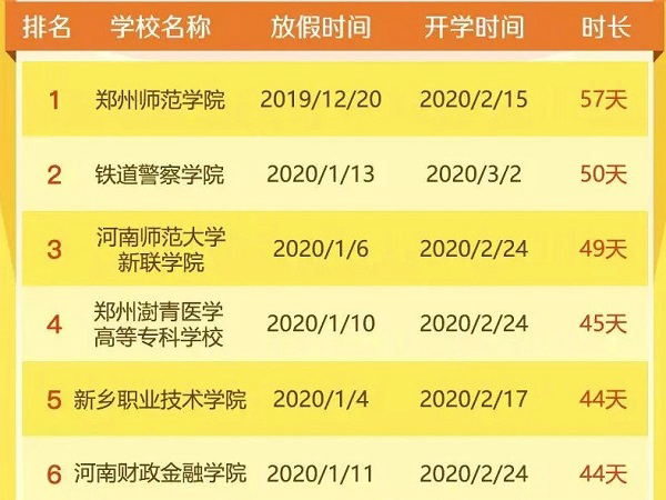 近日,河南省教育厅公布了2020年河南高校寒假放假时尚的排行榜,而在这所榜单中涉及到了49所高校,在这其中放假时长最长的是前三名是郑州师范学院,铁道警察学院,河南师范大学新联,而其中放假最短的则是郑州大学,只有28天。