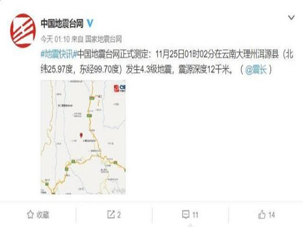 大理洱源发生4.3级地震 大理古城有轻微震感