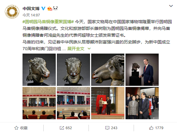 97岁赌王捐圆明园马首 各房罕见合体亮相捐赠仪式