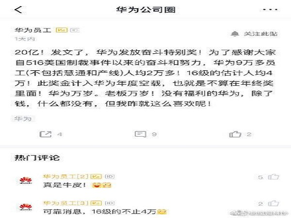 别人家的公司 华为发放20亿奖金:人均十万