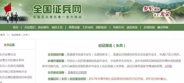 女兵应征报名开始 有意者可登录全国征兵网报名