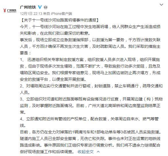 12月1日晚间,广州地铁集团发布关于十一号线沙河站路面坍塌事件的通报。广州地铁集团称,十一号线沙河站在施工过程中发生地面坍塌,给人民群众生产生活造成损失和影响,在此致以最深切的歉意。事发后,现场立即成立应急救援指挥部,以救援为第一要务,千方百计搜救失联人员,千方百计确保不再发生次生灾害,及时疏散周边人员。