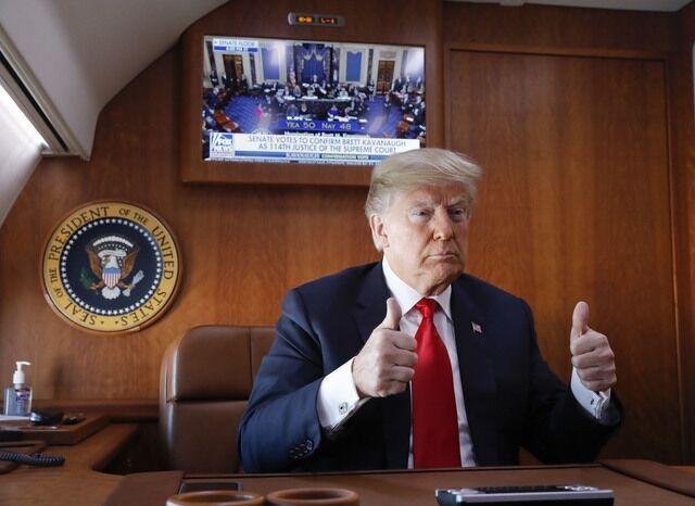 参院以50票赞成48票反对通过卡瓦诺的提名案后,在空军一号上观看投票结果的美国总统特朗普立刻双手举起大拇指让媒体拍照。