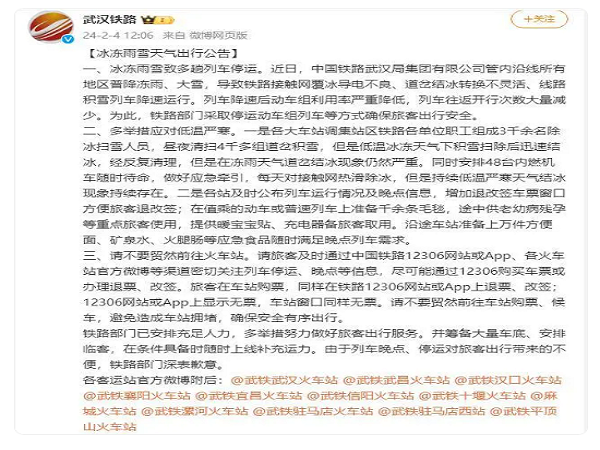 武汉铁路发布冰冻雨雪天气出行公告:多趟列车停运,请不要贸然前往火车站