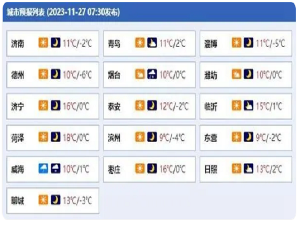 中国天气网讯 未来三天(11月27日至29日),山东烟台、威海雨雪持续,普遍有小到中雪,局地或现大雪,其他地区则以晴或多云为主。