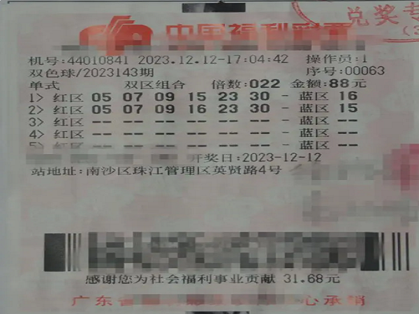 12月12日,福彩双色球第2023143期开奖,广州南沙一站点售出的一张2注号码22倍投注的88元彩票,中出22注656万多元一等奖特别奖,总奖金高达1.44亿多元,这是广州继2013年后再次爆出亿元巨奖,同时创下广州彩市单人中奖最高纪录。
