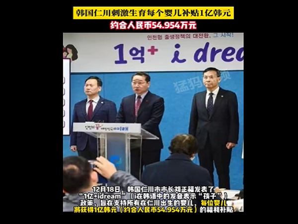 金融界12月19日消息 据韩国《亚洲经济》,18日仁川市市长刘正福发表了"1亿+idream"(i在韩语中的发音表示“孩子”)政策,旨在支持所有在仁川出生的婴儿,每位婴儿将获得1亿韩元(约合人民币54.954万元)的福利补贴。