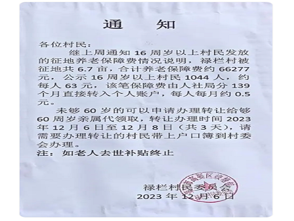 近日,广东省肇庆市高要区禄栏村向村民发放征地养老保障费,但每人每月仅分得0.5元。12月8日,禄栏村民委员会的工作人员回应称,因村里征地太少,只有6.7亩,所以分到的钱少。