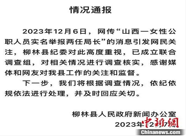 中新网太原12月7日电 (刘小红)6日,网传“山西一女性公职人员实名举报两任局长”的消息引发关注。对此,山西省柳林县政府新闻办7日发布情况通报称,柳林县纪委已成立联合调查组,进行调查核实,将根据调查情况依纪依规依法进行处理,并及时回应关切。