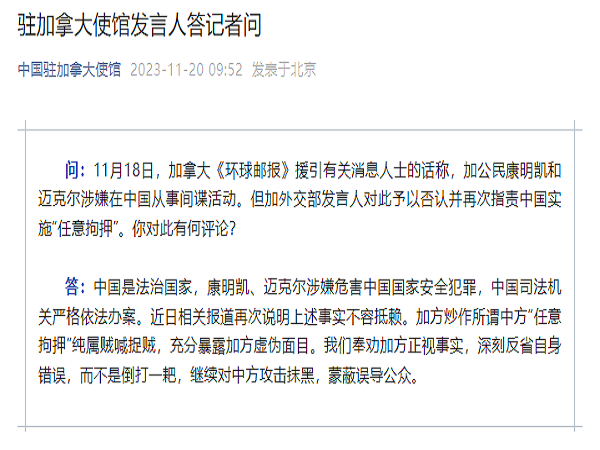 中使馆:加方炒作所谓中方“任意拘押”纯属贼喊捉贼