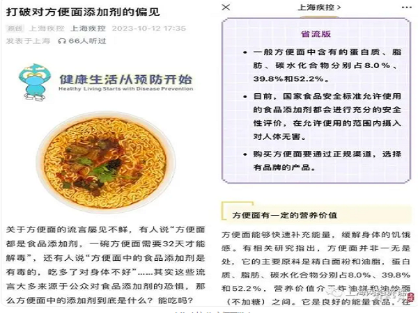 前不久,上海市疾病预防控制中心通过微信公众号“上海疾控”发布了一篇《打破对方便面添加剂的偏见》,指出“方便面有一定的营养价值”“方便面中的食品添加剂自有用处且安全可食”。有粉丝向上海辟谣平台提问:能相信吗?