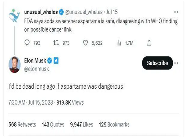 马斯克:如果阿斯巴甜致癌,我早就死了