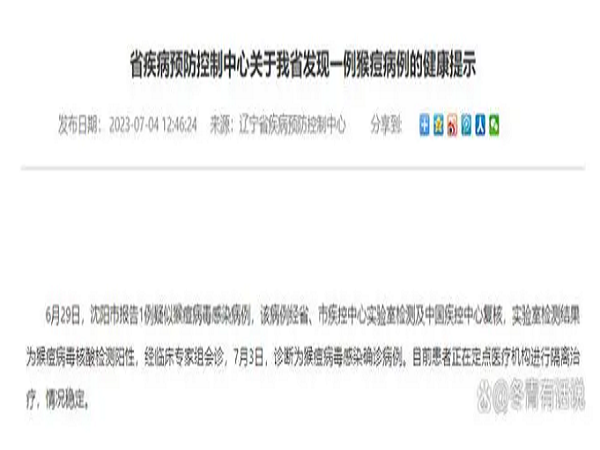 央视网消息:辽宁省疾病预防控制中心网站7月4日消息,6月29日,沈阳市报告1例疑似猴痘病毒感染病例,该病例经省、市疾控中心实验室检测及中国疾控中心复核,实验室检测结果为猴痘病毒核酸检测阳性,经临床专家组会诊,7月3日,诊断为猴痘病毒感染确诊病例。目前患者正在定点医疗机构进行隔离治疗,情况稳定。